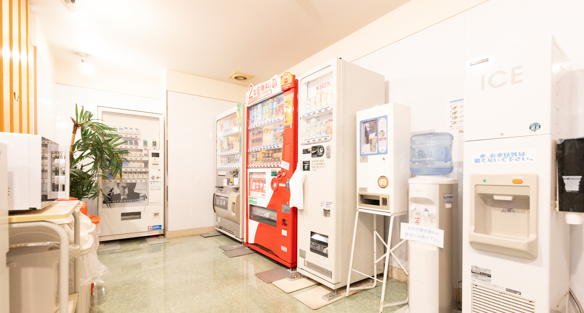 各種飲料水とタバコの自販機、電子レンジ、ポット、製氷機、高純度水が設置されています。